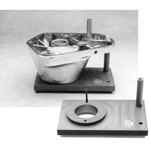 Use to hold cam cover for removing and installing bushings. Clamps in vice or Bridgeport® mill; holds cam cover flat and keeps it from being scratched.