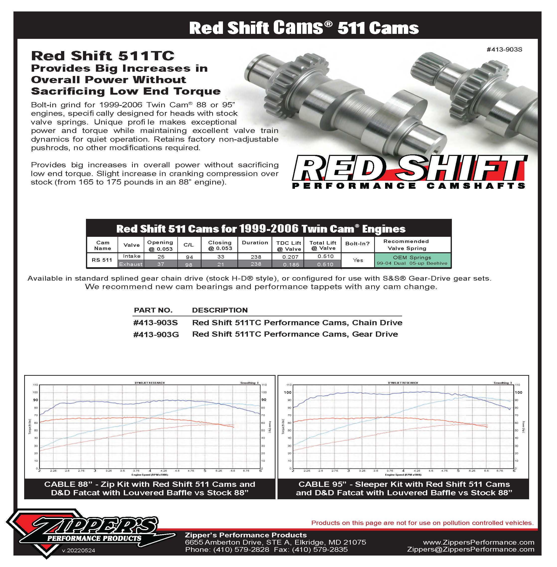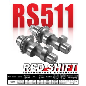 The RS511 is the most powerful bolt in cam for 1999-2004 Twin Cam® 88 or 95″ engines, specifically designed for heads with stock valve springs. Unique profile makes exceptional power and torque while maintaining excellent valve train dynamics for quiet operation.