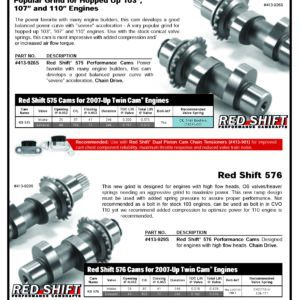 The Red Shift Cams® RS576 was developed off of the success of the RS575 cam, but meant to work with the heavier springs and valves that are present in CVO motorcycles and many aftermarket engine builds. The cam timing events are the same as the RS575, which results in the same power output and feel of the proven RS575 design. The new profile yields a quiet valve train when used with heavier 5/16″ stem valves and higher performance valve springs. This is an excellent cam to use in CVO engines, and really shines with more compression and increased airflow are added.
