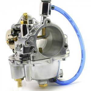 ThunderJet™ is a jet-able, externally mounted third fuel circuit that improves the performance of 2-circuit carbs such as the S&S Super. Unmodified, these carbs typically have a low speed, or intermediate, circuit that supplies fuel from idle to approximately 2500 rpm, at which point the carbs’ main jet circuit becomes active, delivering more fuel to the engine. These two circuits must then supply fuel for the rest of the rpm range. The problem is: the remaining rpm range is too wide (typically 2500-6500 rpm) for only 2 circuits to handle efficiently. The tuner generally encounters problems jetting the carb to give good, crisp mid-range response and still have strong topend power. A compromise is the result. Back the main jet down, carburetion in the mid-range is good but top-end is lacking. Increase the main, top-end improves but now the mid-range is rich; flat spots or hesitation is encountered. The answer? ThunderJet™!