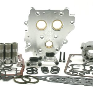 Includes blueprinted billet cam plate, Zipper’s patented dual-piston hydraulic cam chain tensioners, USA-made Tappet/Lifters, 2007-up style oil pump with increased feed and scavenge capacity, a set of USA-made Torrington/full-compliment inner cam bearings, and a cam chest gasket set. These top-shelf components will increase performance and durability to any Twin Cam Engine.