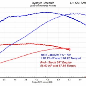Take your 88” Twin Cam to 117” with Zipper’s Muscle 117 kit! A new 4-3/8” stroke crankshaft replaces the original 4” crank; new stress-relieved 4-1/8” bore cylinders are precision fit with forged pistons set for 10.6:1 compression. Your heads receive Zipper’s Stage III CNC porting with new guides, oversize valves, performance springs and manual compression releases. Our Red Shift 577 cams provide big torque & HP gains across the entire RPM range. Also included are Pro-Taper pushrods and EZ-Adjust covers, with all gaskets needed for assembly. Highly recommended option: our # 417-495 blueprinted cam chest upgrade with our Red Shift Dual Piston hydraulic cam chain tensioners, blueprinted billet plate, HV oil pump, cam bearings and quality USA lifters for improved reliability and durability. Case boring required, Timken recommended. Enjoy Big, Broad Power at every throttle position with the Muscle 117!